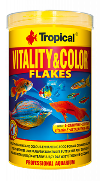 Vločkové krmivo s vysokým obsahom bielkovín, zvýrazňujúci vyfarbenie a vitalizujúce, určené na každodenné kŕmenie bylinožravých a všežravých rýb. Vzhľadom k zvýšenému obsahu bielkovín, vitamínu E a lecitínu sa odporúča predovšetkým v období rastu a množenia rýb. V krmive sú prítomná prírodné farbivá - betakarotén a astaxantín, ktoré ovplyvňujú zintenzívnenie farieb rýb, majú prospešný vplyv na priebeh mnohých fyziologických procesov, vrátane rozmnožovania a chráni bunky proti škodlivému pôsobeniu voľných radikálov. Aby boli ryby schopné lepšie využívať tuky obsiahnuté v krmive, bol Vitality & Color obohatený L-karnitínom, ktorý podporuje ich metabolizmus.